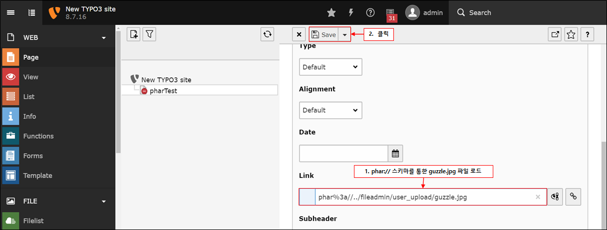 이후 이미지 링크를 추가할 때 Link 필드에 phar%3a//../fileadmin/user_upload/guzzle.jpg를 입력합니다.