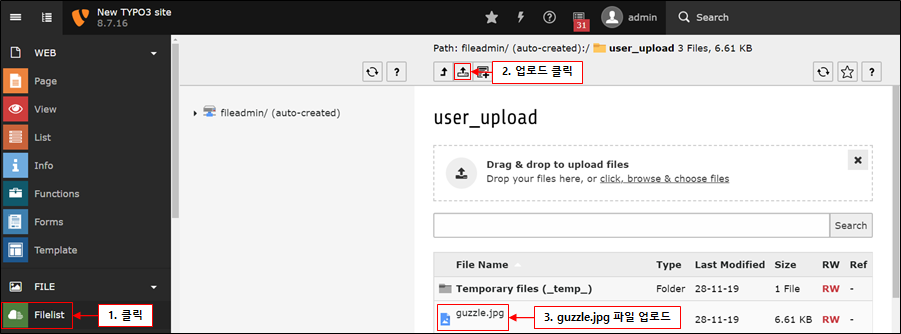 Typo3의 Filelist 메뉴를 통하여 fileadmin/user_upload 폴더에 생성한 guzzle.jpg 이미지를 업로드합니다.