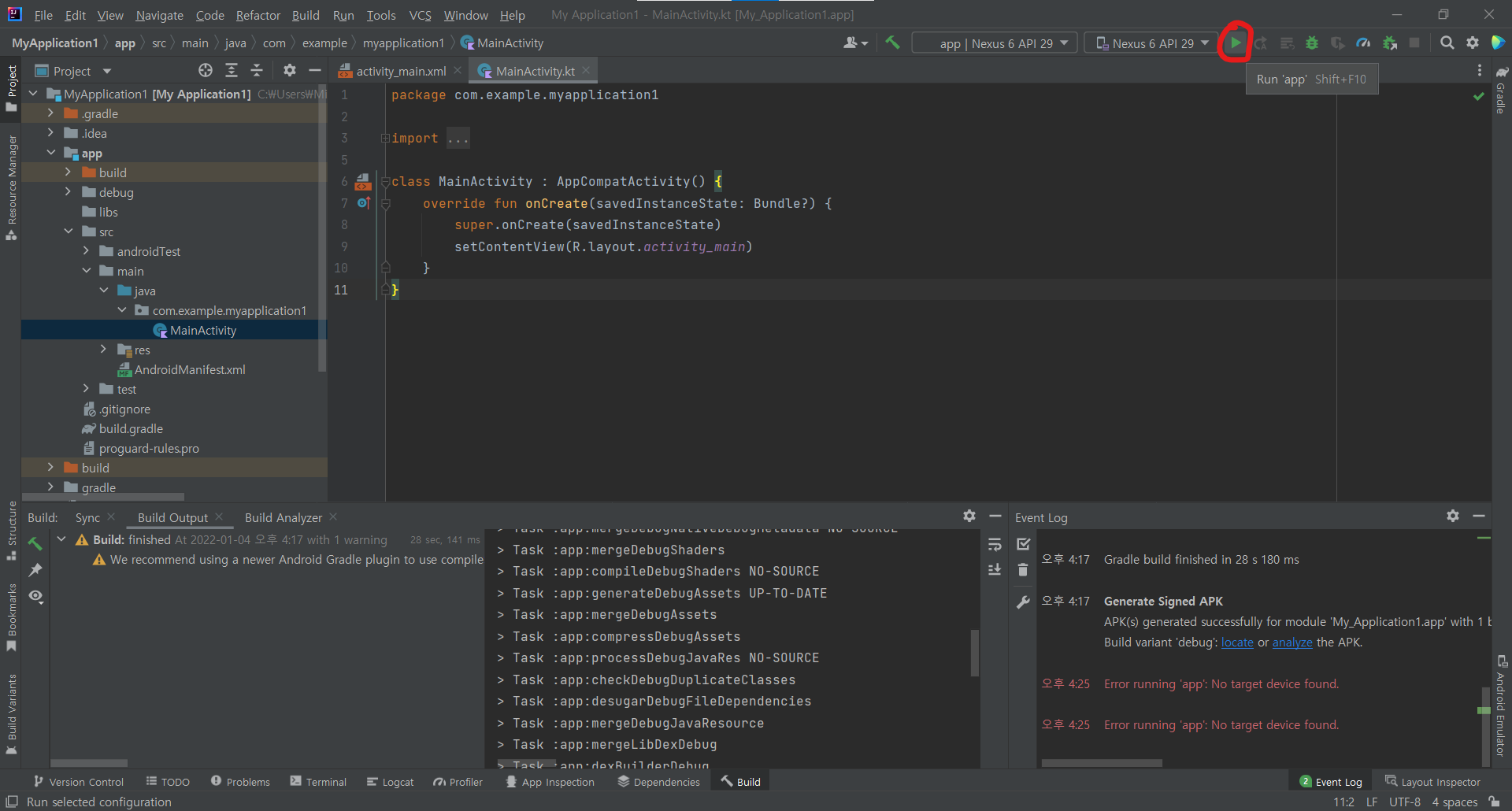 가상 애뮬레이터 세팅이 마무리 되었다면, Run APP 버튼을 클릭합니다.