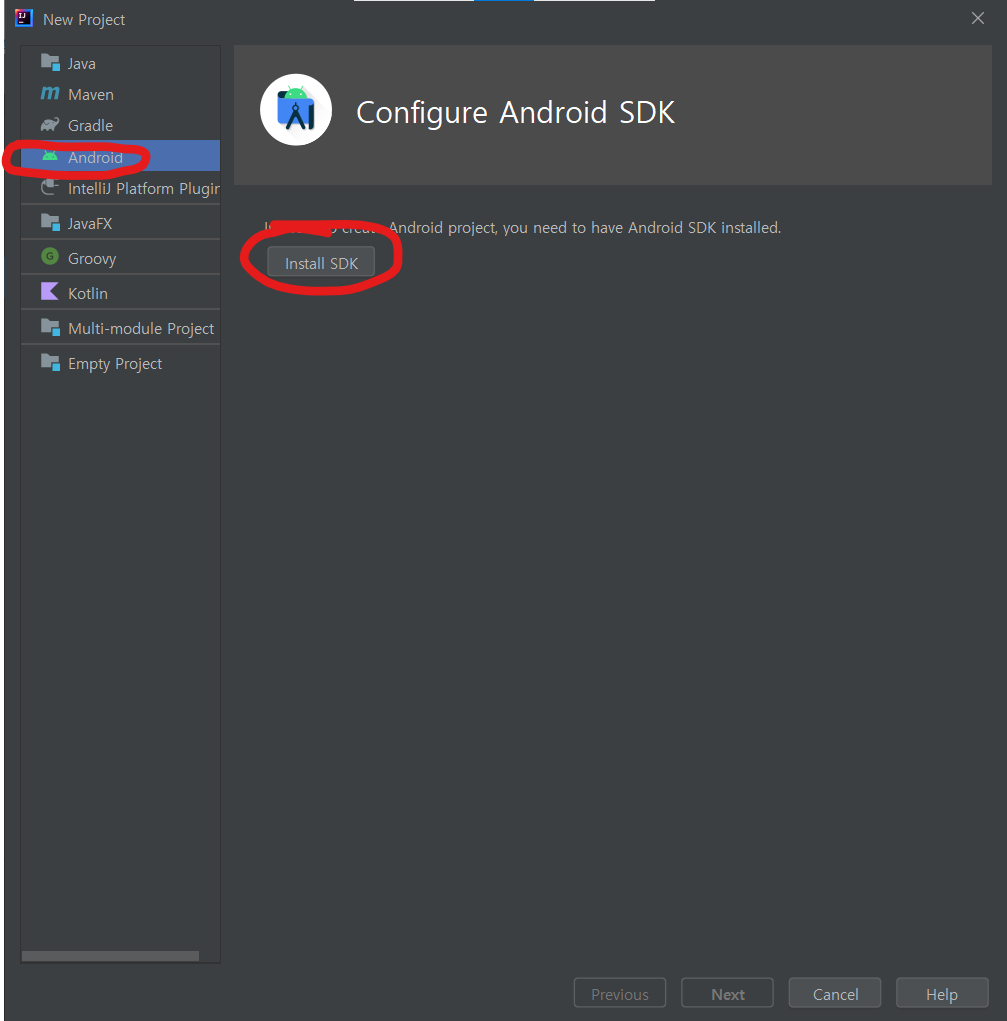 이후 New Project의 Android 탭을 클릭한 뒤, Install SDK 버튼을 클릭하여 설치를 진행합니다.