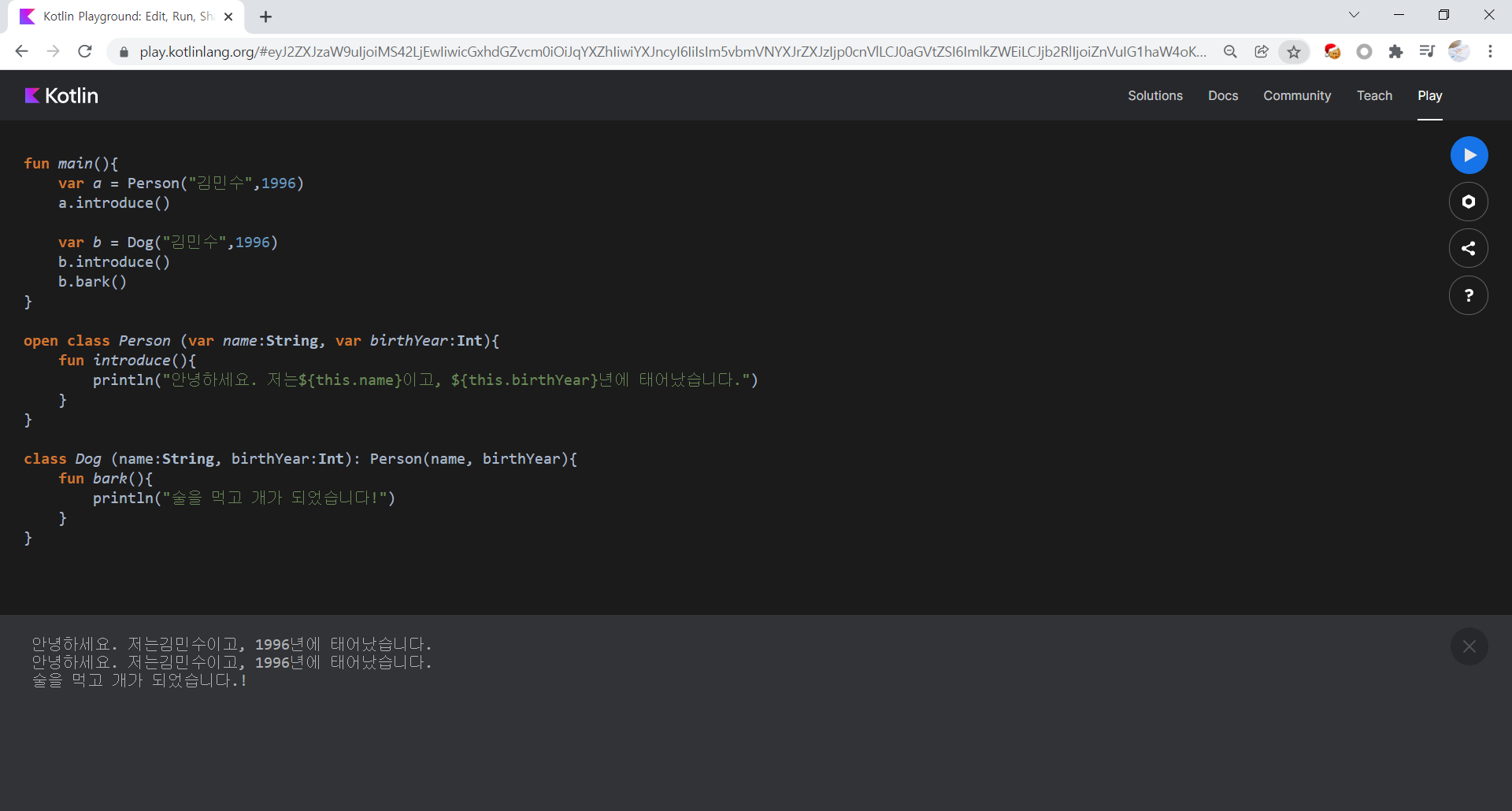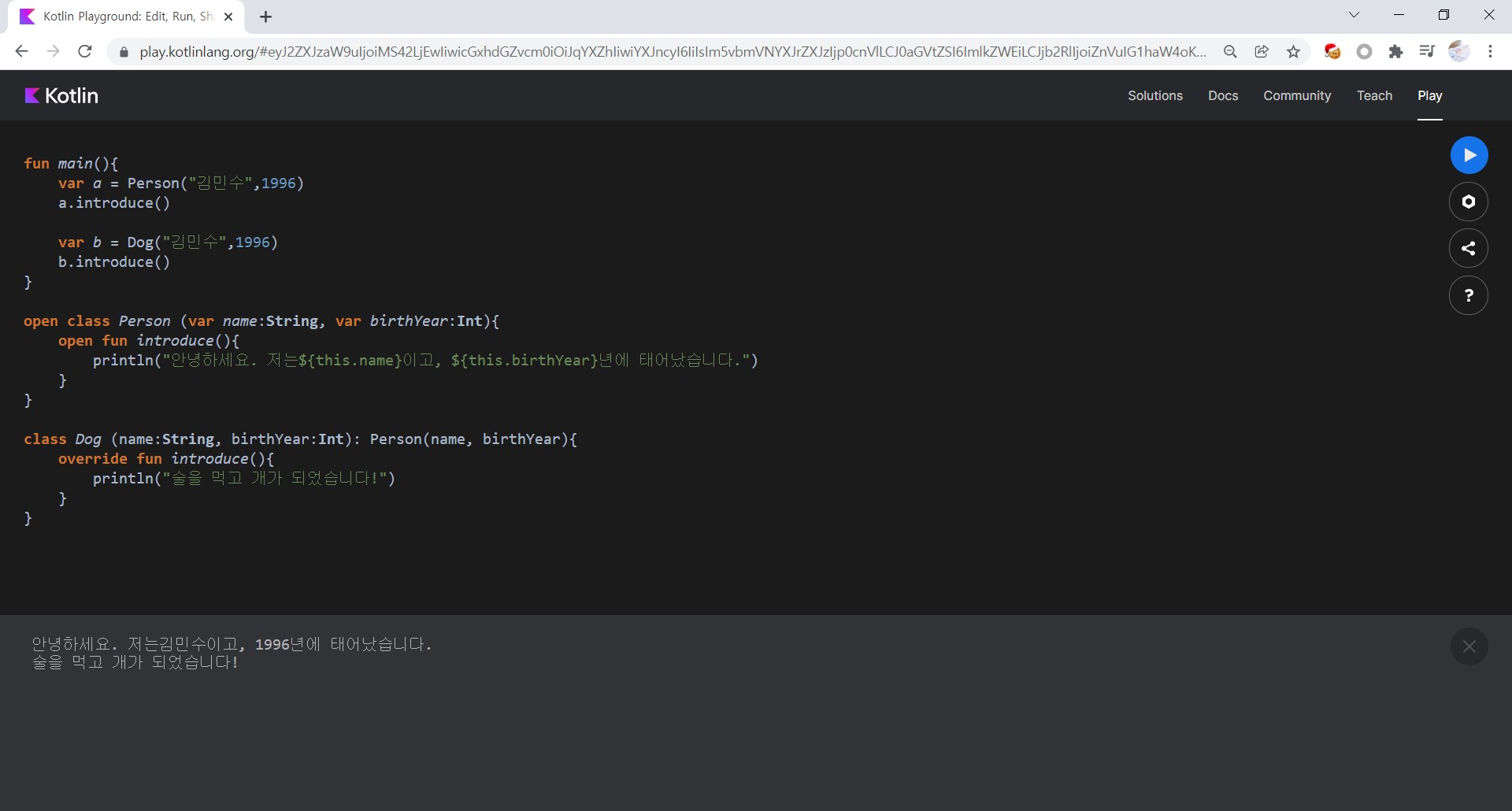 println("안녕하세요. 저는${this.name}이고, ${this.birthYear}년에 태어났습니다.")