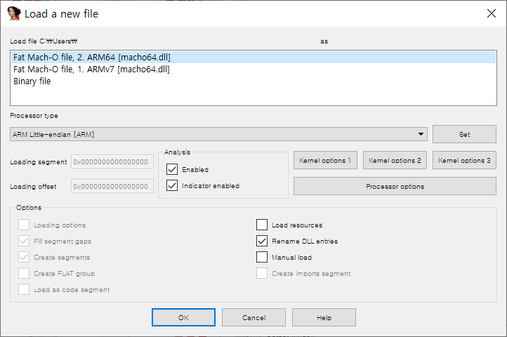 IDA에서 Fat Binary인 IPA를 실행할 경우 아래 그림과 같이 어떤 Architecture를 이용할 것인지 묻는 알림 창이 뜹니다. 현재 실행되고 있는 Architecture를 클릭한 뒤, 분석이 마무리될 때까지 기다립니다. (여기선 ARM64)