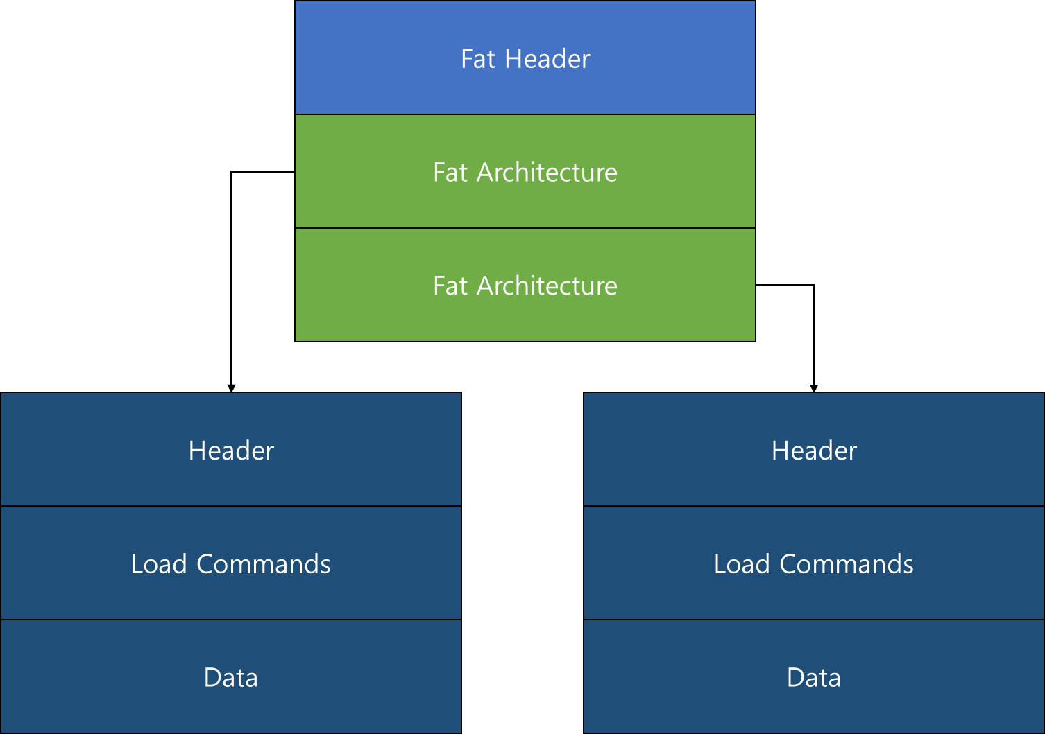 먼저 Fat Binary란 하나의 실행 파일이 여러 아키텍처에서 적용될 수 있도록 구성된 파일이며, 아래의 그림과 같이 Fat Binary는 Fat Header와 Fat Architecture로 구성되어 있습니다. 각각의 Architecture는 각각의 실행 코드를 가르키고 있으며, OS에서 로드 시 해당 Architecture에 맞는 Mach-O Format이 로딩됩니다.