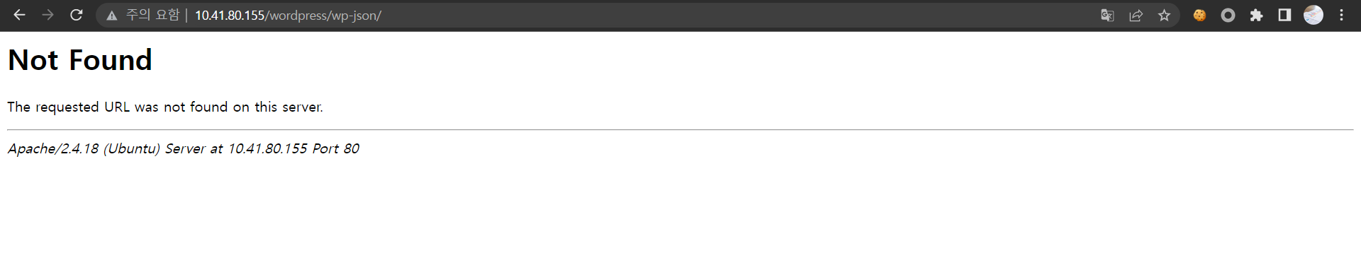 그러나 Wordpress 설치 후 REST API 기능 사용을 위해 /wp-json/에 접속할 경우 Not Found 화면만이 노출되었습니다.