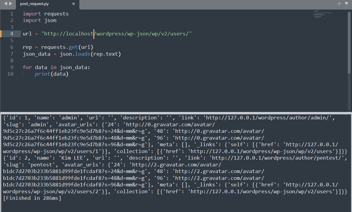 해당 취약점은 /wp-json/wp/v2/users 경로에 접근하면 발생하는 취약점으로 공격 방법이 매우 간단합니다.