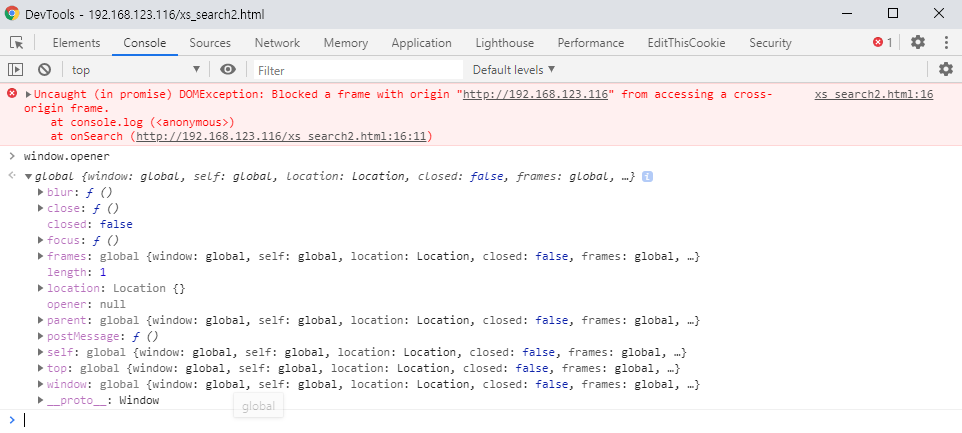 SOP가 발생하는 상황에서도 확인할 수 있는 몇 가지 속성들이 존재하는데, 해당 속성들을 이용하여 정상적으로 실행됐을 때와 아닐 떄를 구분할 수 있다면 SOP를 우회할 수 있습니다. 그 중 한가지가 window.opener.length 값의(부모 객체의 frame, iframe 태그 수) 차이가 발생하는 상황입니다.