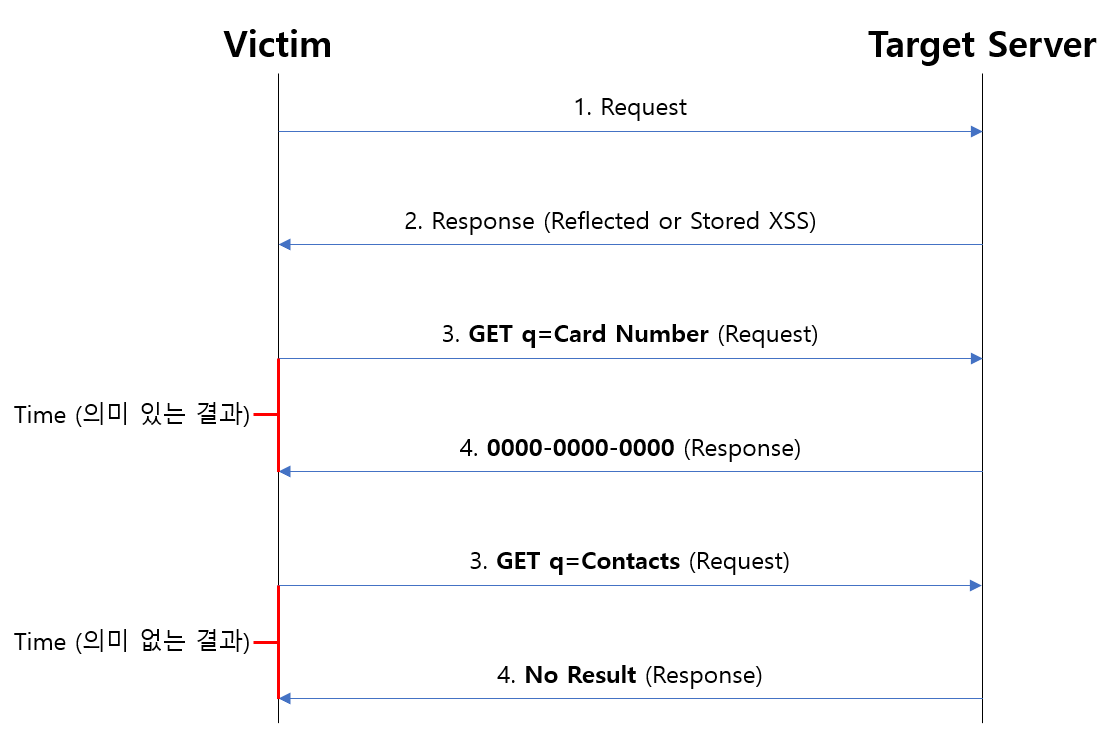 아래 그림의 Target Server는 메일 서버이며 검색 결과가 존재하는 경우와 존재하지 않는 경우의 시간 차이가 1초 이상 난다고 가정해본다면, 공격자는 XS Search 공격을 통하여 메일 서버에 존재하는 모든 메일에 접근할 수 있게 됩니다.