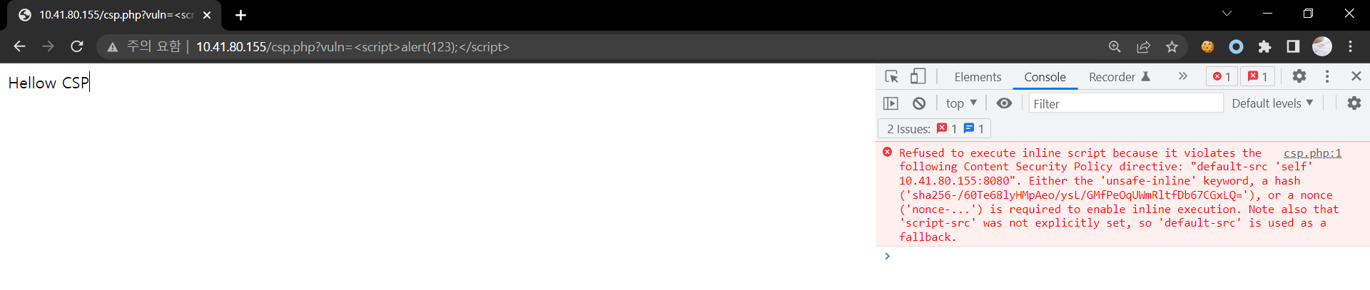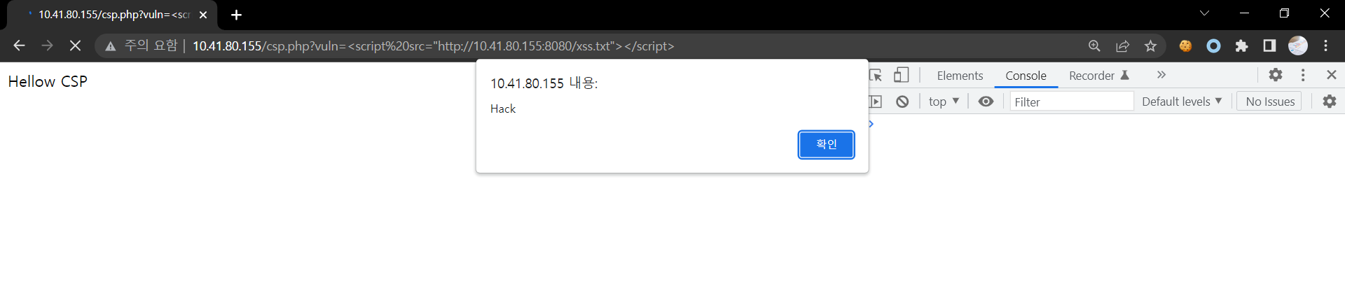 Hellow CSP<script src="http://localhost/xss.php?xss=alert('hack');//"></script>