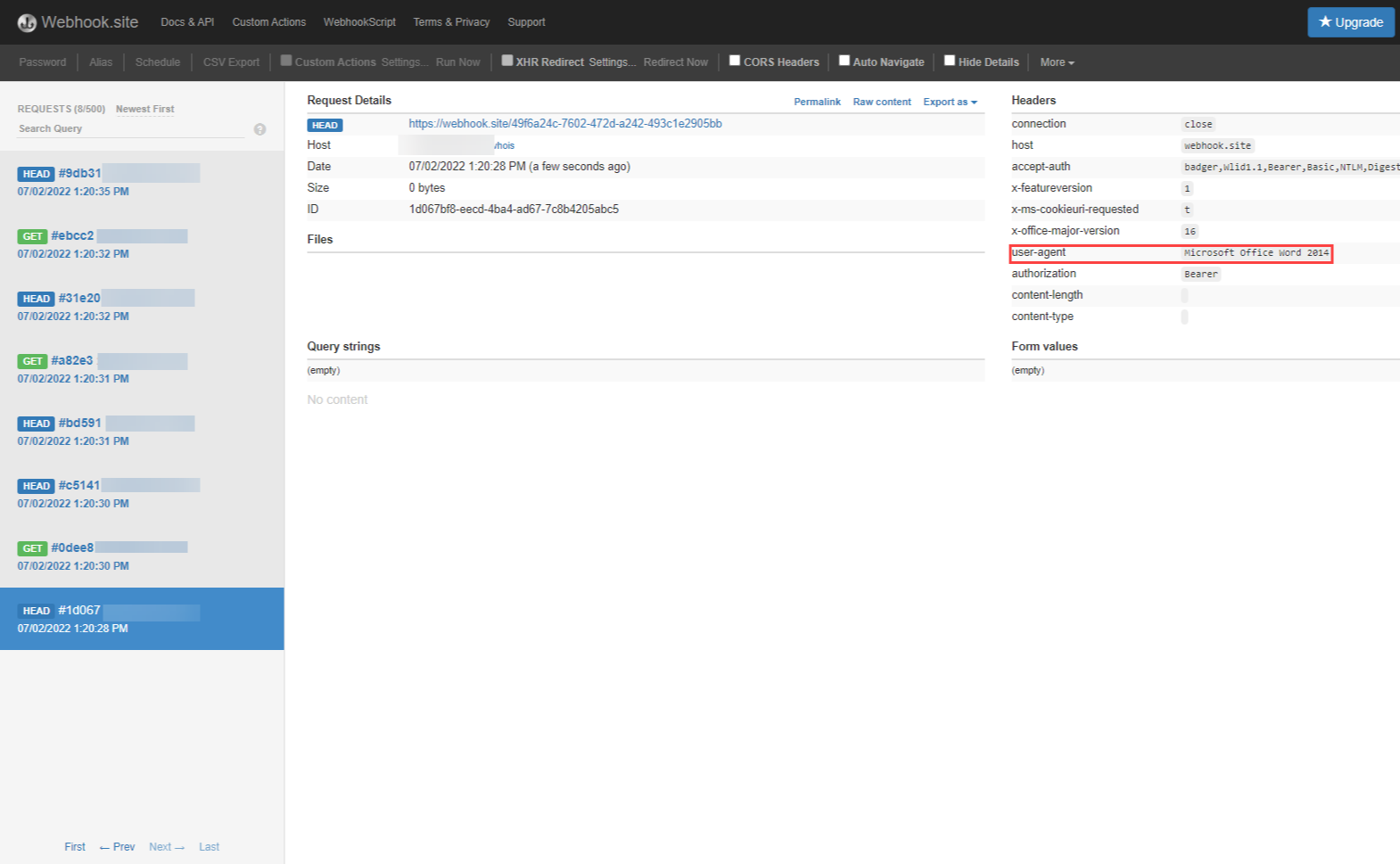 8. 이후 해당 파일을 실행할 경우 일정 시간이 경과한 뒤, webhook.site에 자동으로 접속되는 것을 확인할 수 있습니다.