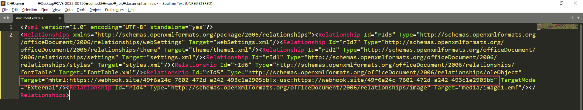 5. "./word/_rels/document.xml.rels" 파일을 열어 외부 ole리소스의 Target 속성 값을 webhook URL 링크로 수정 후 저장합니다.