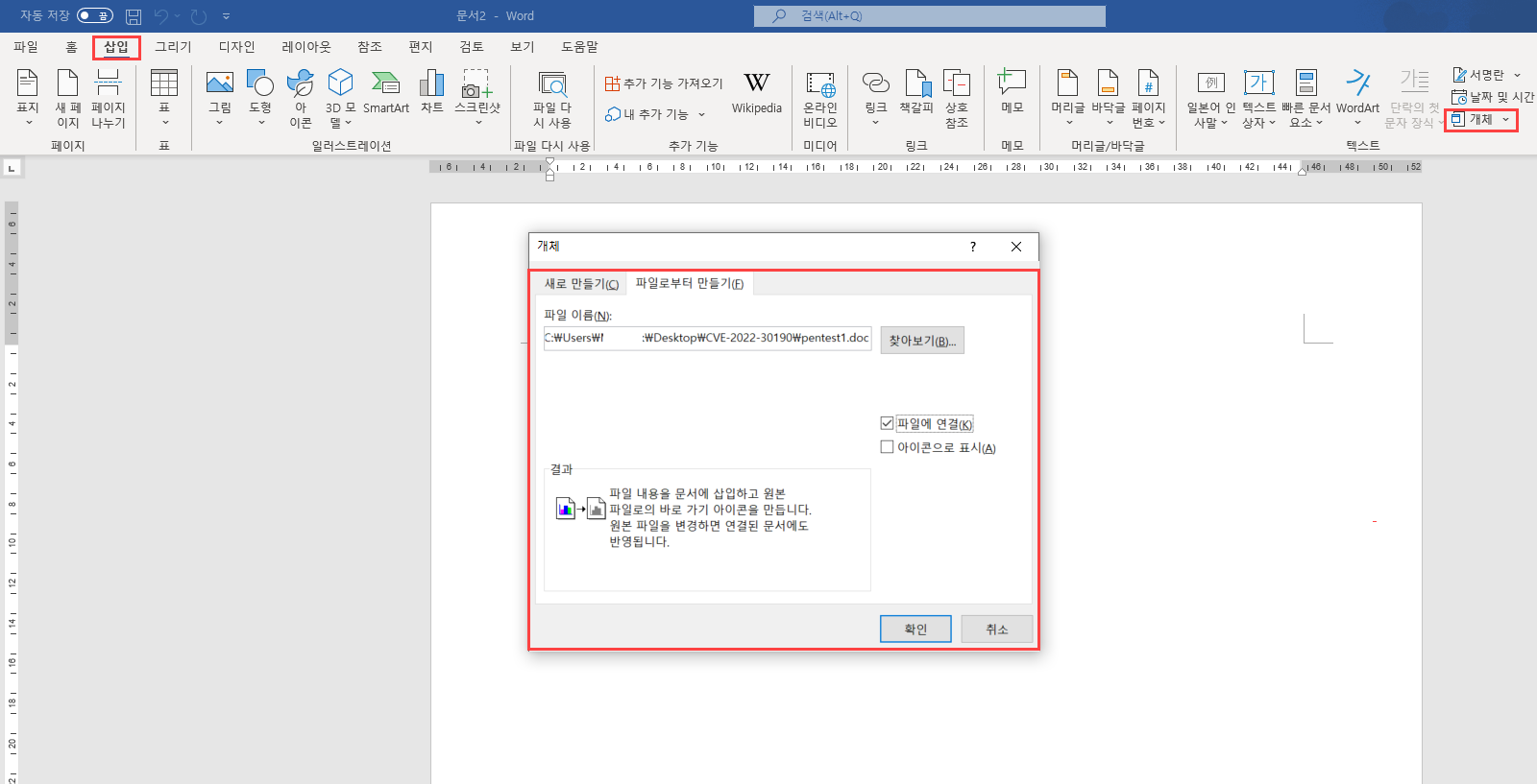 2. 새로 워드를 열어서 "삽입 > 개체 > 파일로부터 만들기 > pentest1.doc 선택 > 파일에 연결 > 확인" 과정을 통해 개체를 추가한 뒤, 해당 파일도 저장합니다.
