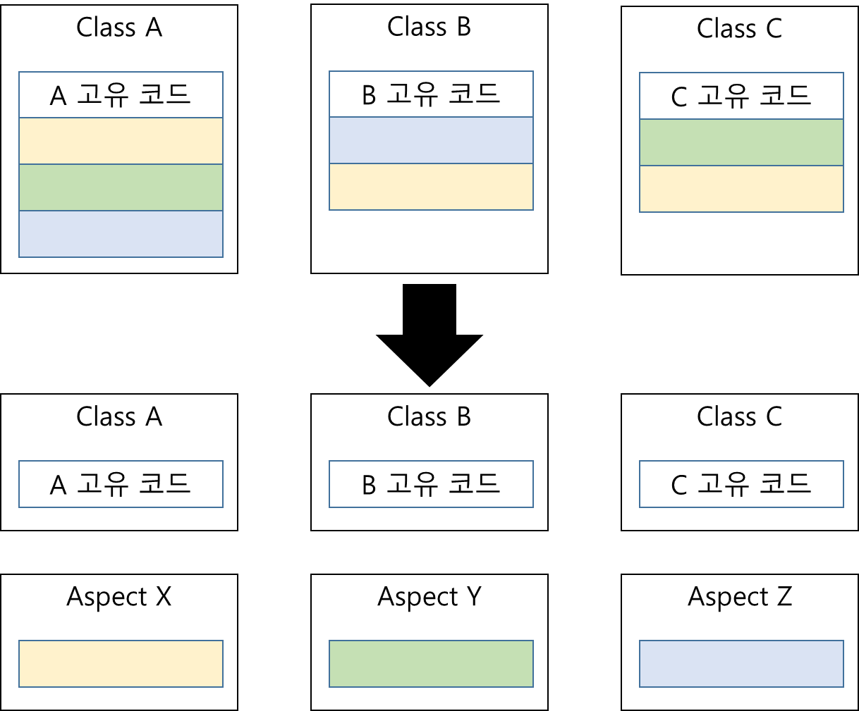 여러 클래스, 메서드에 걸쳐 나타나는 비슷한 코드들을 Concern이라고 부르는데, 아래의 그림에서 색깔 하나당 하나의 Concern을 나타낸다고 가정해보겠습니다.
