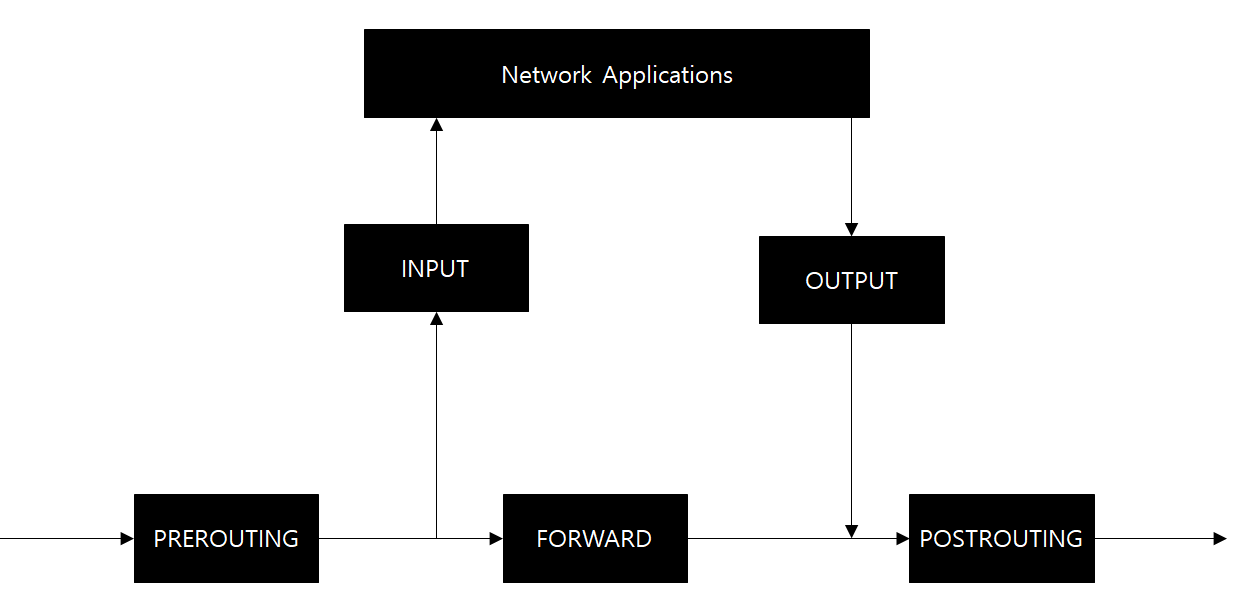 다섯 가지 Hook은 지점에 따라 PREROUTING, INPUT, FORWARD, OUTPUT, POSTROUTING 으로 불립니다.