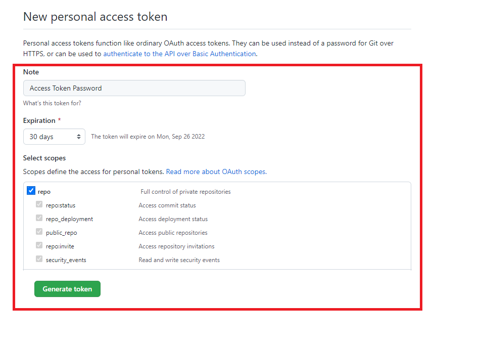 3. 메모, 만료 기간, 권한 범위 설정 후 Generate token 클릭