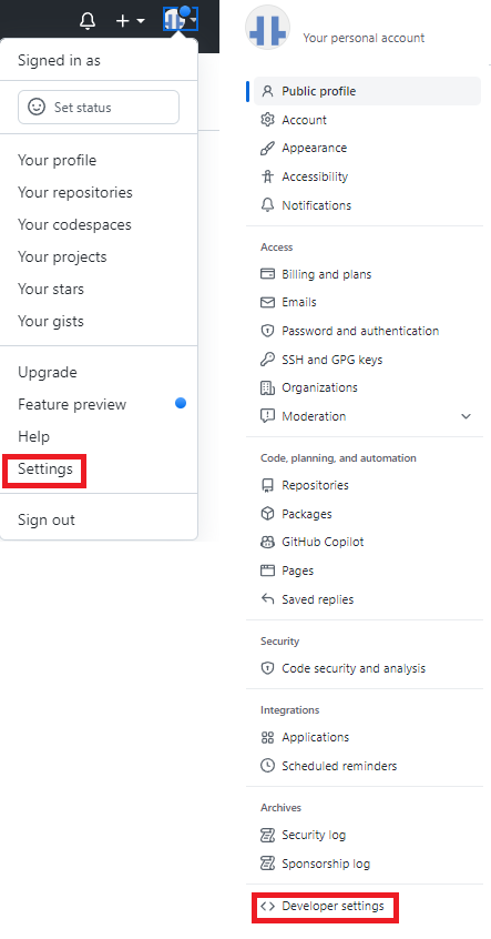 1. 프로필 -> Settings -> Developer settings 클릭