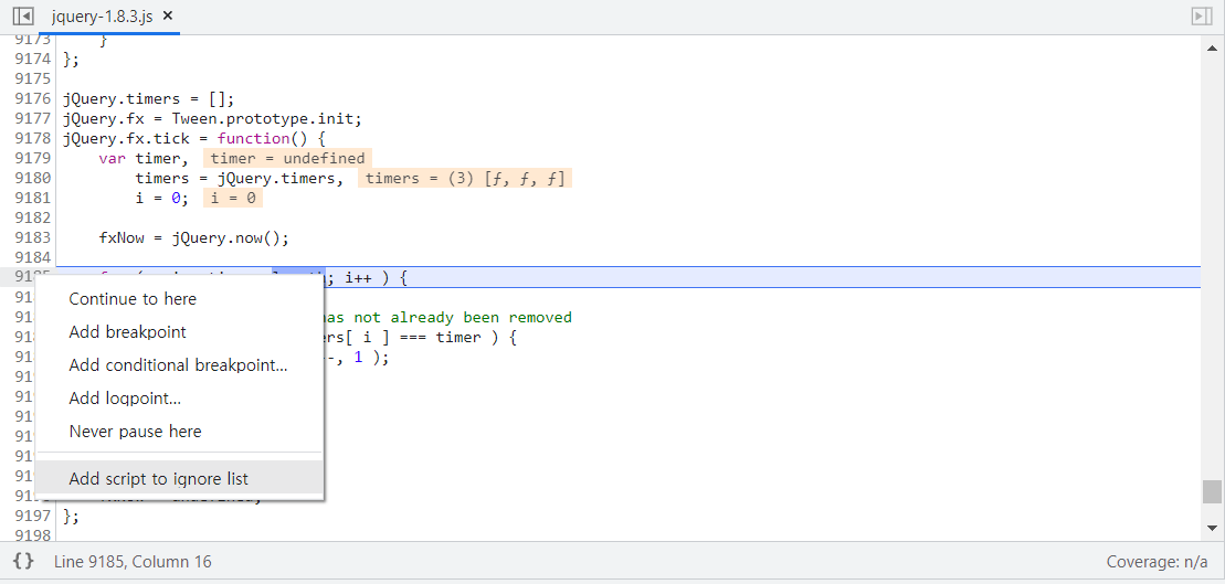 계속 디버깅이 잡히는 Line에서 오른쪽 클릭을 한 뒤, "Add script ot ignore list" 버튼을 클릭하면 해당 페이지에서는 더이상 Debgguer Paused 현상이 발생하지 않았습니다.