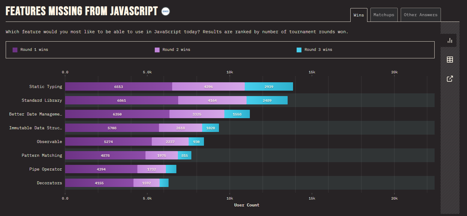 해당 투표에서 1위를 차지한 것은 Static Typing(정적 타이핑)이었는데, 동적 타입 언어로 개발된 Javascript의 경우 대규모 협업 과정에서 여러가지 에러가 발생할 수 있는데 이러한 에러를 바로 바로 확인할 수 있는게 아니라 Runtime 환경에서만 확인을 할 수 있다는 치명적인 단점을 가지고 있어 생산성의 큰 저하를 가져왔습니다.