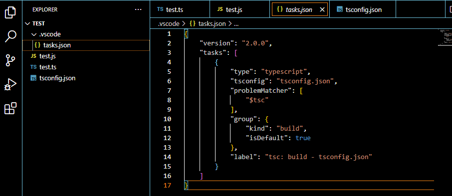 지금까지의 설정으로는 코드가 바뀔때마다 매번 Build를 새로해줘야 합니다. 코드가 변경될 때마다 새로 Compile을 해주려면 tasks.json 파일을 아래와 같이 변경해주면 됩니다.