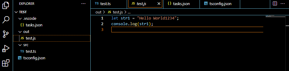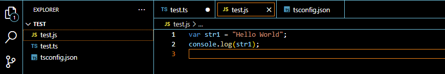 이후 test.ts 파일을 생성한 뒤, Ctrl+`로 Terminal을 열어 명령어를 입력함으로써 Compile 과정을 통해 ts 파일을 js 파일로 변환할 수 있습니다.