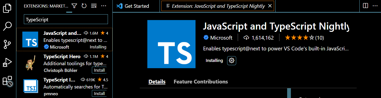 그리고 Extensions에서 TypeScript를 검색한 뒤, JavaScript and TypeScript Nightly를 설치해줍니다.