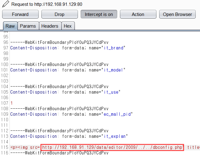 사진을 등록한 후 확인 버튼을 클릭한 뒤, Burp Suite를 이용하여 Request 데이터의 it_explan 파라메터에 <img> 태그의 경로를 dbconfig.php 파일을 가르키도록 변경합니다.