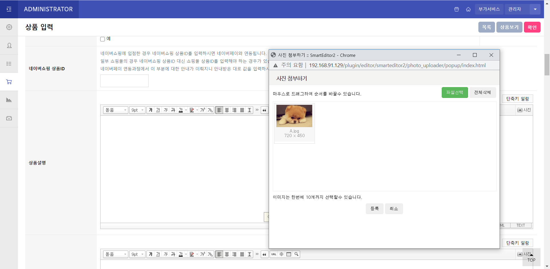 해당 코드를 악용하기 위해, 먼저 상품 관리 메뉴에 등록된 상품의 설명창에서 임의의 사진을 첨부합니다.