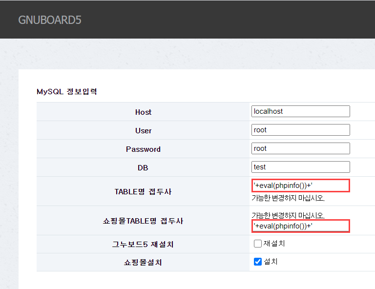 그누보드, 영카트를 재설치하는 과정에서 TABLE명 접두사에 명령문을 삽입하여 설치할 경우, Command Injection 취약점이 발생하였습니다.