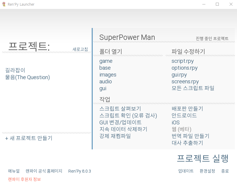 - screens.rpy : 화면의 디자인과 동작을 정의할 수 있는 파일
