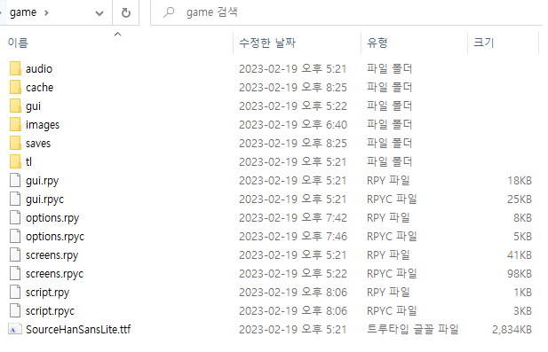 - script.rpy : 게임 스크립트를 작성하는 파일