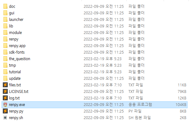 2. 다운로드 받은 압축 파일을 해제한 뒤, renpy.exe 파일을 실행합니다.