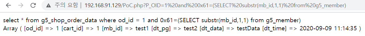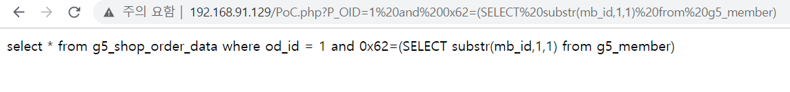 P_OID 값 : P_OID=1 and 0x62=(SELECT substr(mb_id,1,1) from g5_member)
