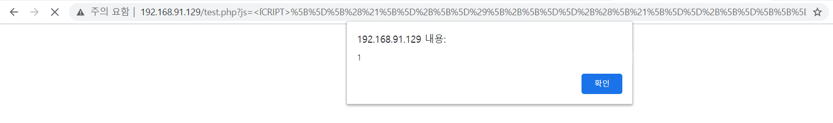 해당 코드를 URL 방식으로 Encoding 한 뒤, ſCRIPT 사이에 넣고 페이지에 접근할 경우 XSS 취약점이 발생하는 것을 확인할 수 있습니다.