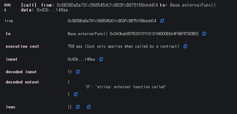 external로 선언된 externalFunc() 함수는 해당 함수를 선언한 Smart Contract에서 호출할 수 없으나, Account에서는 호출 가능함