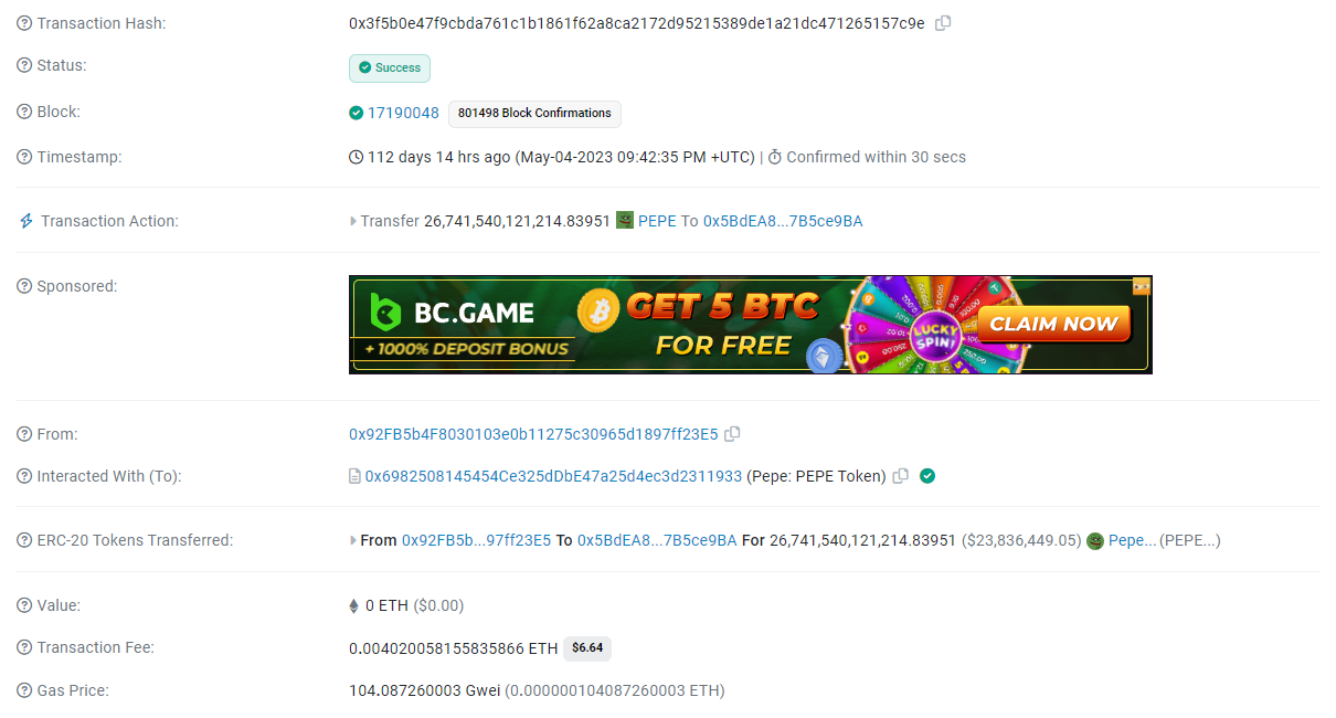 해당 Wallet(0x5B..)은 토큰의 전체 발행량 대비 약 6.36%의 물량을 가지고 있었습니다. 그리고 이 토큰은 pepecexwallet.eth로 등록된 Wallet(0x92..)에서 전송 받은 토큰이었습니다.