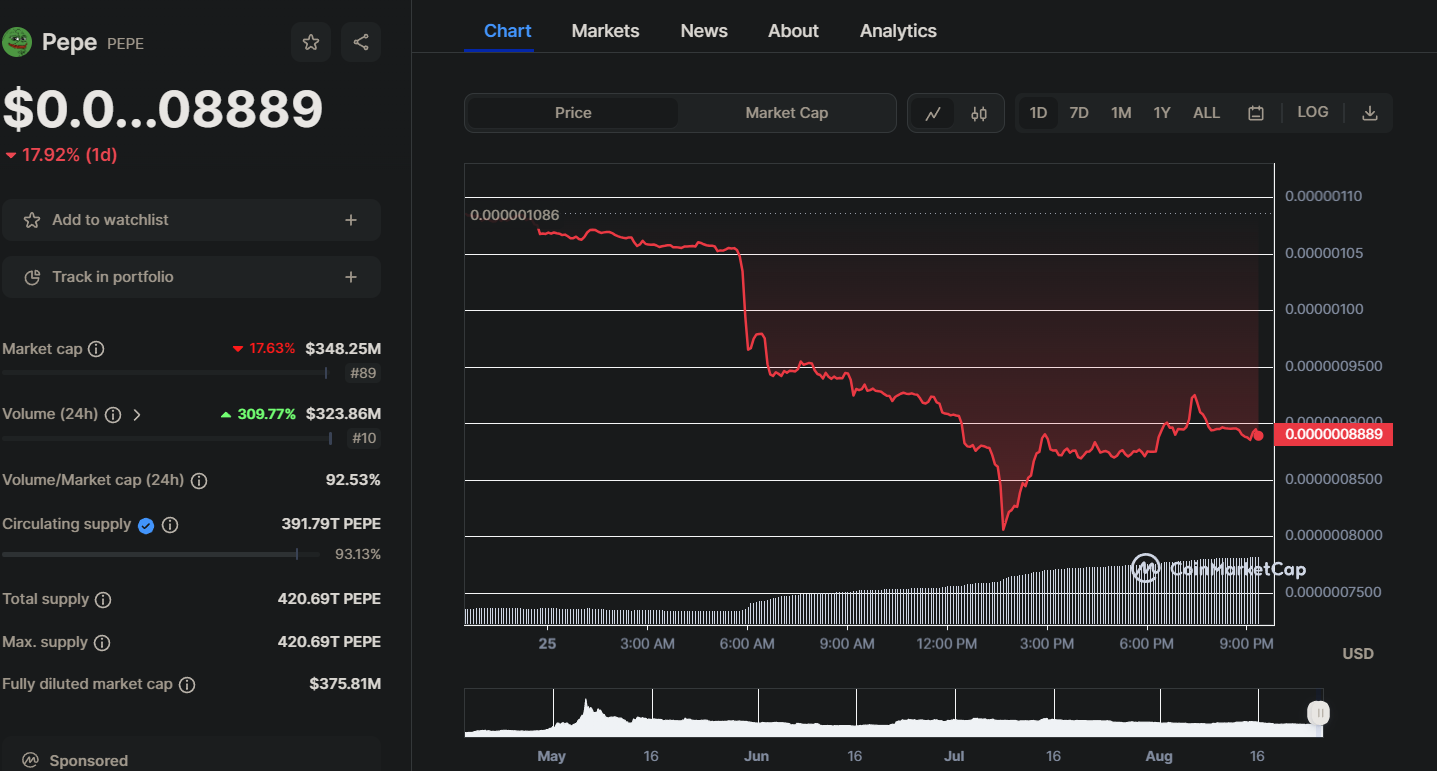 시장 매도 후 PEPE 토큰의 가격은 곤두박질 쳤습니다.