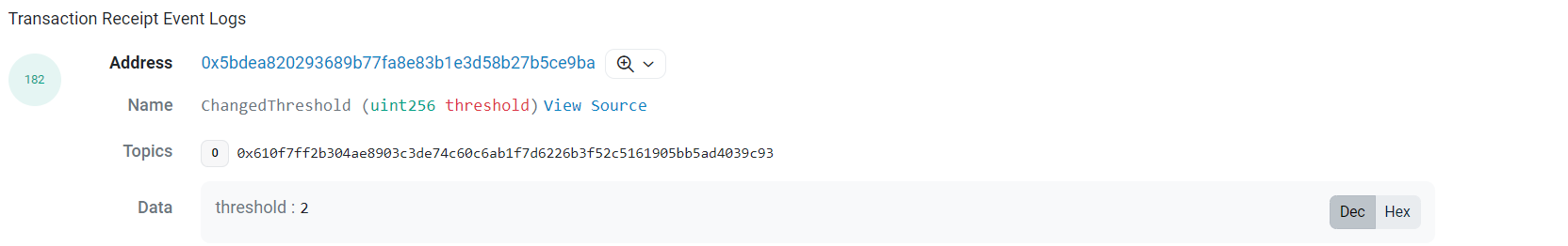 그리고 재단의 MultiSig Wallet(0x5B..)을 사용하기 위해 필요한 서명 개수인 threshold를 5개에서 2개로 변경하였습니다. 사실 이미 재단의 물량을 일부 털어버린 이후인데, 왜 필요한 서명 개수를 줄였는 지는 모르겠습니다. (서명을 줄일려면 5개의 서명이 필요하고요)