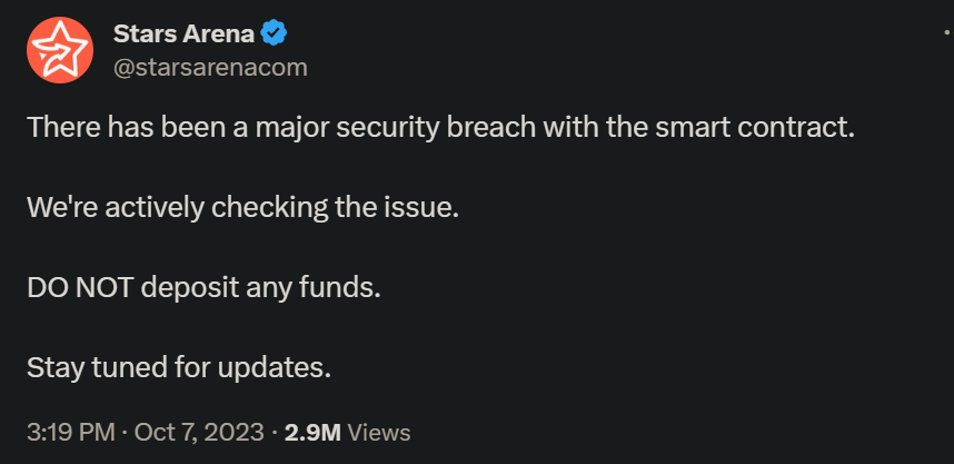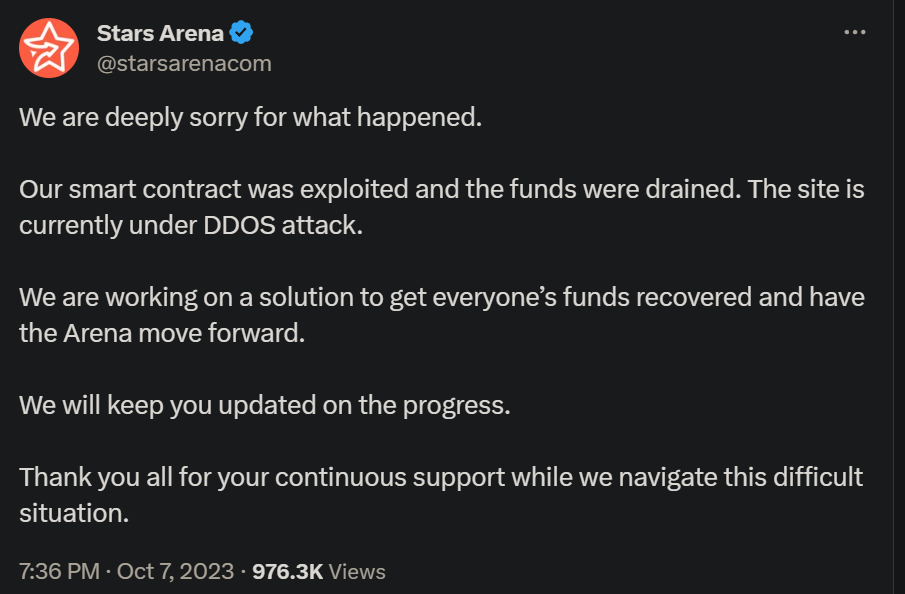 23년 10월 7일, Stars Arena에서 Smart Contract 취약점으로 인해 심각한 보안 이슈가 발생했다고 밝혔습니다.