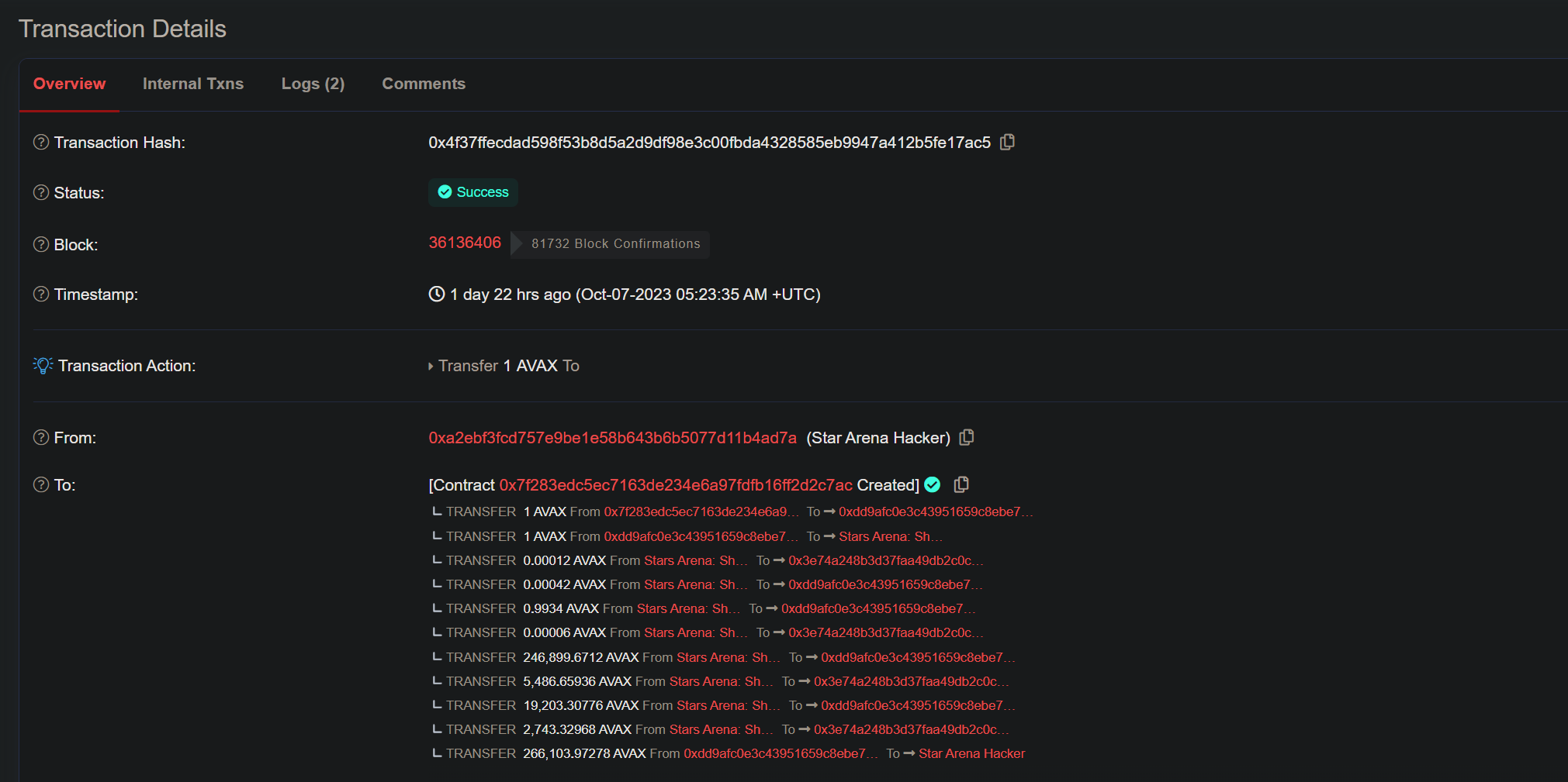 해킹 사고가 발생한 Transaction에서 볼 수 있듯이, Stars Arena: Shares(0xA4..eC)에서 공격자 EOA(0xa2...7A)로 266,103.97278 AVAX가 전송된 것을 볼 수 있습니다.