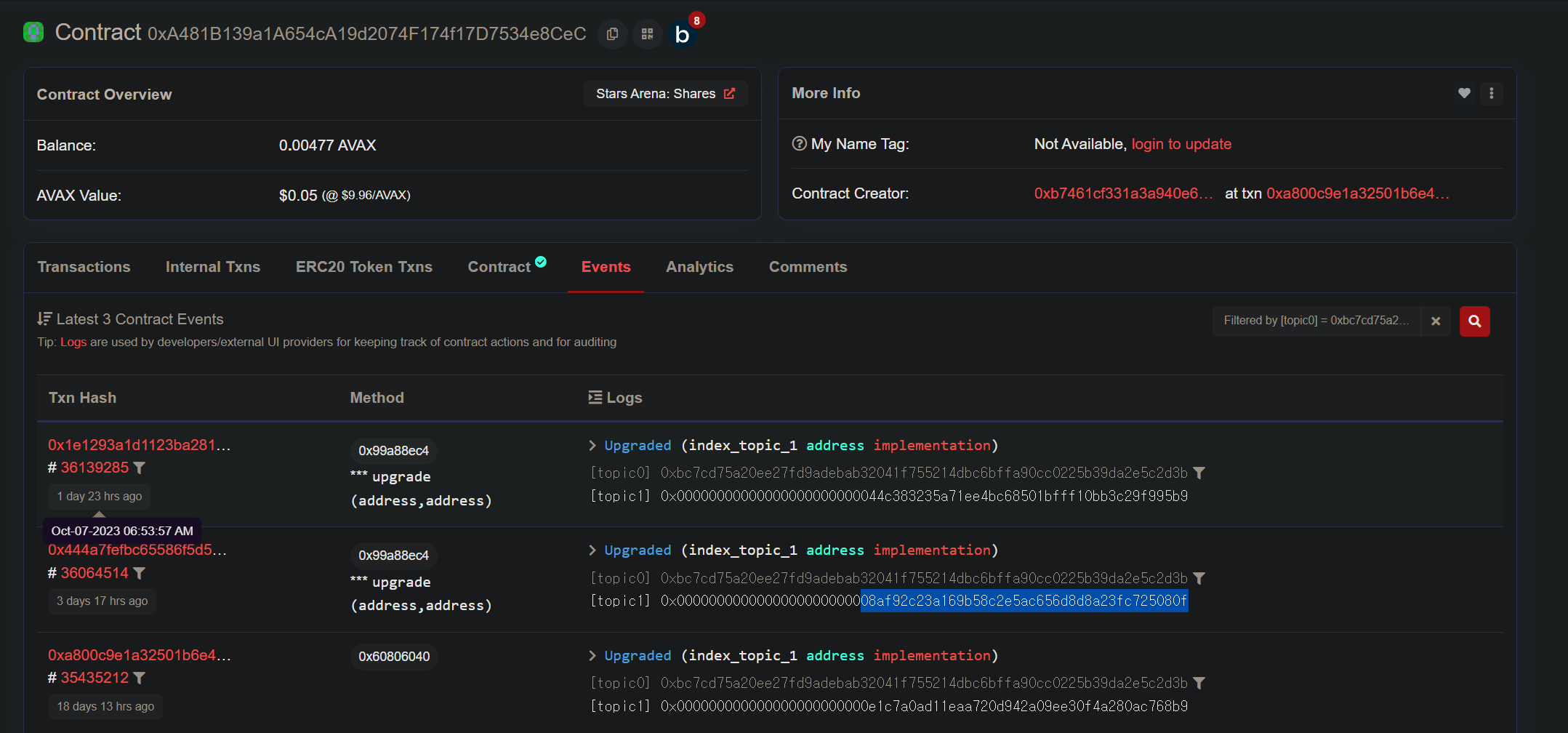 Stars Arena Contract는 사고가 발생한 10월 7일 이후에 upgrade를 통하여 implementation address를 변경하였습니다. 소잃고 외양간 고치기
