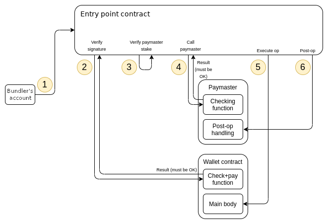 참고로 UserOperation을 수락하기 이전에 Bundler는 RPC 메서드를 통해 simulateWalletValidation 함수를 호출하여 로컬에서 서명의 유효성을 검증하고 실제로 수수료를 지불하는 지 시뮬레이션해야 합니다.