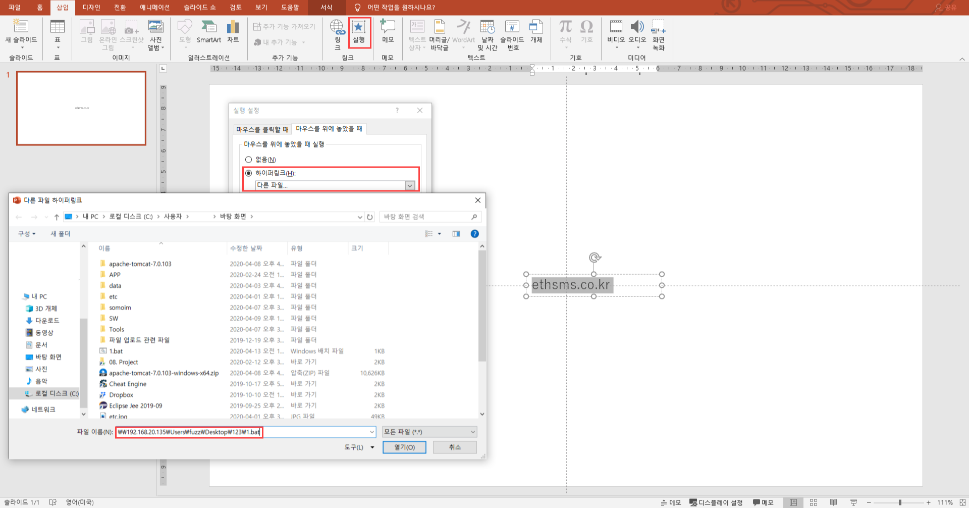 먼저 공격에 사용될 문구를 입력한 뒤, 삽입 -> 실행 -> 마우스를 위에 놓았을 때 -> 하이퍼 링크(H) -> 다른 파일... 순으로 클릭한 뒤 SMB를 이용하여 미리 공유해둔 배치 파일에 연결합니다.