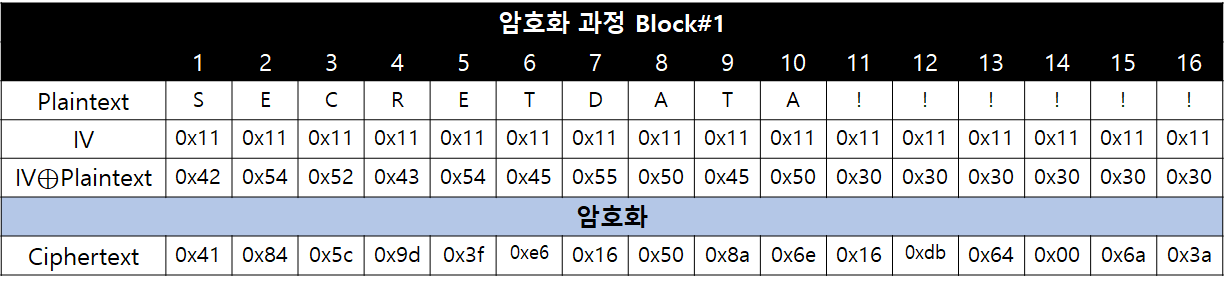 먼저, 아래의 표와 같이 SECRETDATA!!!!!!hacksms.tistory.com를 암호화했다고 가정해보겠습니다. 먼저 첫 번째 블록은 Padding 없이 IV와 XOR 연산 후 암호화가 진행됩니다.