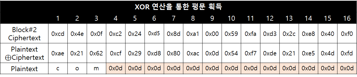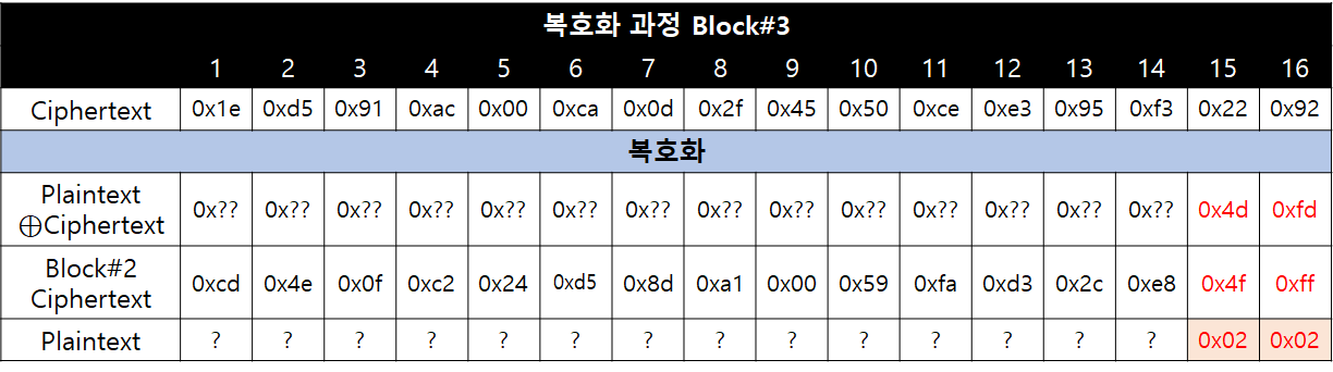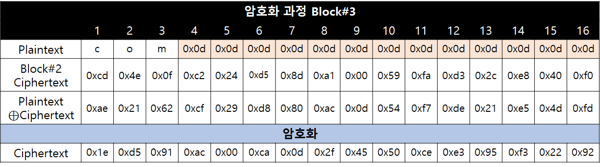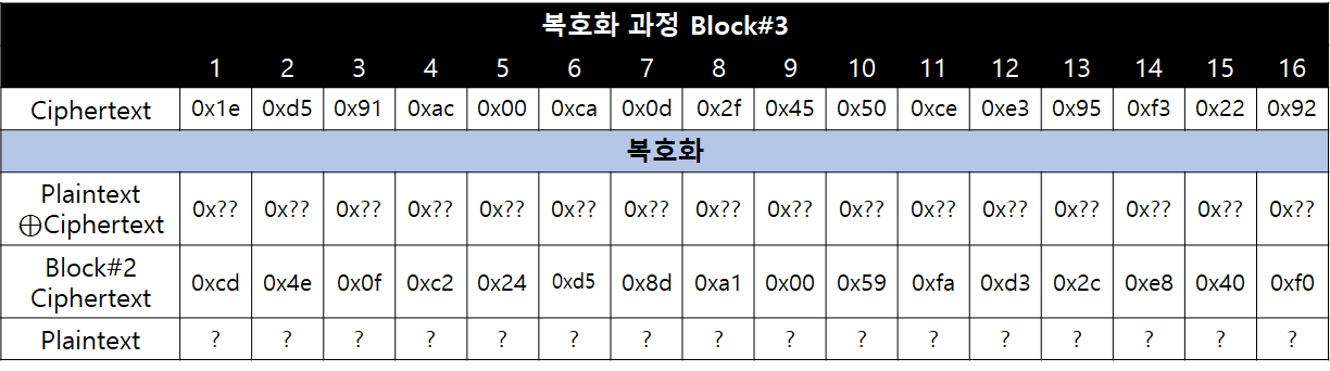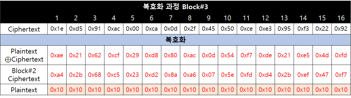 세 번째 블록은 마지막 블록이기 때문에 반드시 Padding이 포함된 문자열일 수 밖에 없습니다. 즉, 암호 시스템은 마지막 블록의 암호문을 복호화한 뒤, 이전 블록의 Ciphertext와 XOR 연산 후 Padding을 검사할 수 밖에 없다는 뜻입니다.