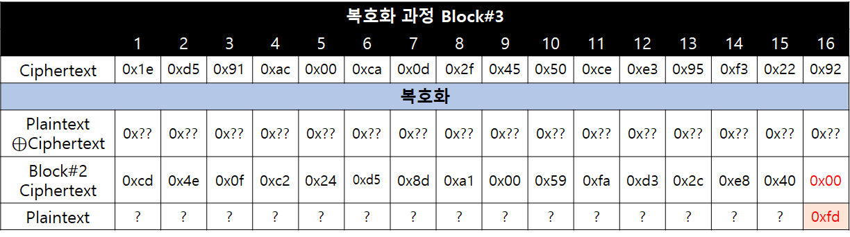 (16Byte의 블록에서 Padding이 가질 수 있는 최대 값은 0x10인데 0xFD가 있다는 것은 Padding이 올바르지 않다는 뜻 이겠죠?)