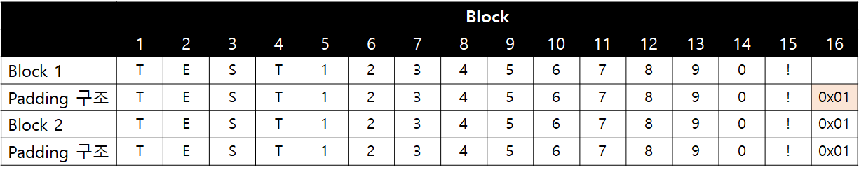 만약, 아래와 같이 "TEST1234567890!"에 Padding이 추가되었을 때 "TEST1234567890!\x01"과 Padding된 데이터를 구분할 수 있을까요?