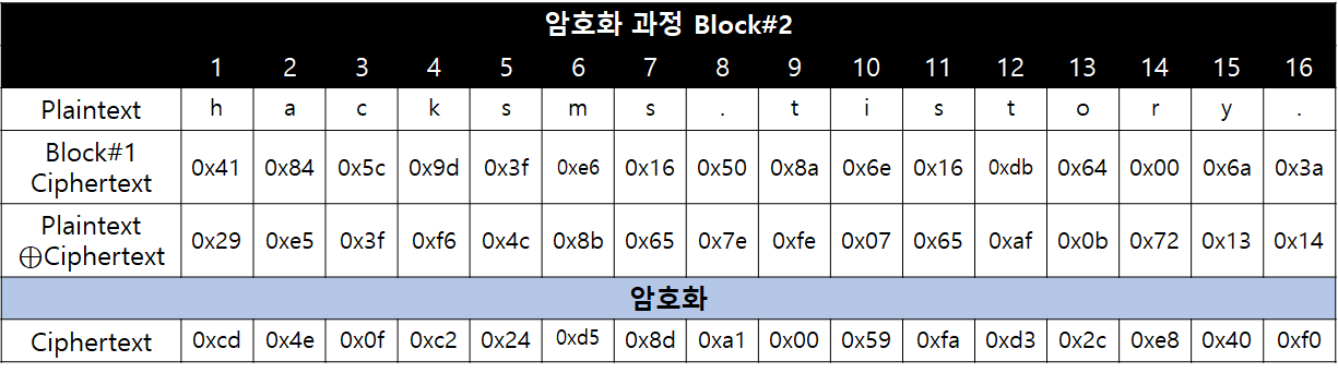 두 번째 블록의 평문 역시 Padding 없이 첫 번째 블록의 암호문과 XOR 연산 후, 암호화가 진행됩니다.