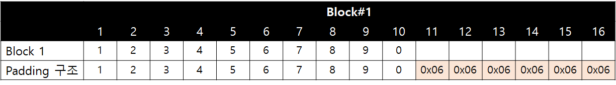 pkcs#7는 패딩 데이터에 패딩의 길이를 입력하는 방식입니다. "1234567890"의 경우 아래와 같은 구조로 16Byte의 블록이 구성됩니다.