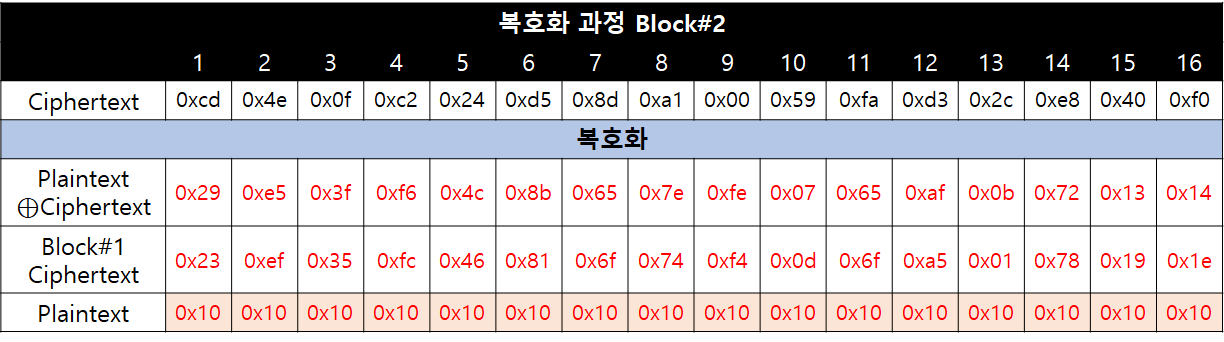 지금까지 두 번재 블록의 암호문 조작을 통해 세 번째 블록의 평문 데이터를 획득할 수 있었습니다. 이와 같은 방식으로 두 번째 블록의 평문 데이터도 획득할 수 있는데요. 여기에는 주의해야할 점이 한 가지 있습니다.
